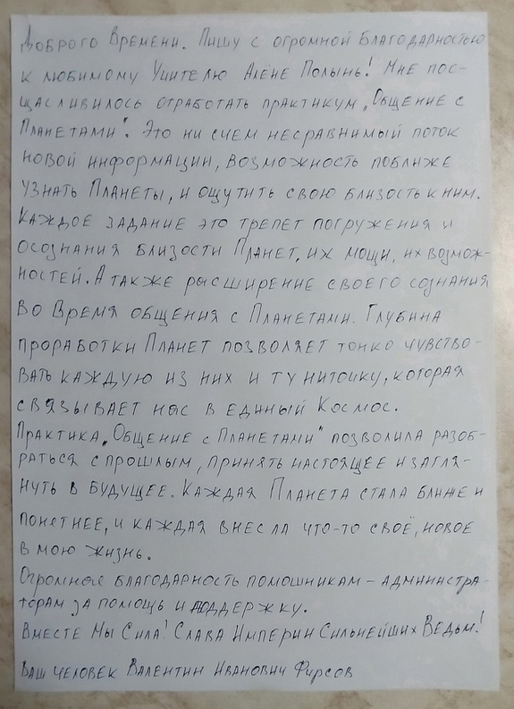 Доброго Времени. Пишу с огромной Благодарностью к любимому Учителю Алене Полынь! Мне посчастливилось отработать практикум «Общение с Планетами». Это ни с чем не сравнимый поток новой информации, возможность поближе узнать Планеты и ощутить свою близость к ним. Каждое задание — это трепет погружения и осознания близости Планет, их мощи, их возможностей. А также расширение своего сознания во Время общения с Планетами. Глубина проработки Планет позволяет тонко чувствовать каждую из них и ту ниточку, которая связывает нас в единый Космос.