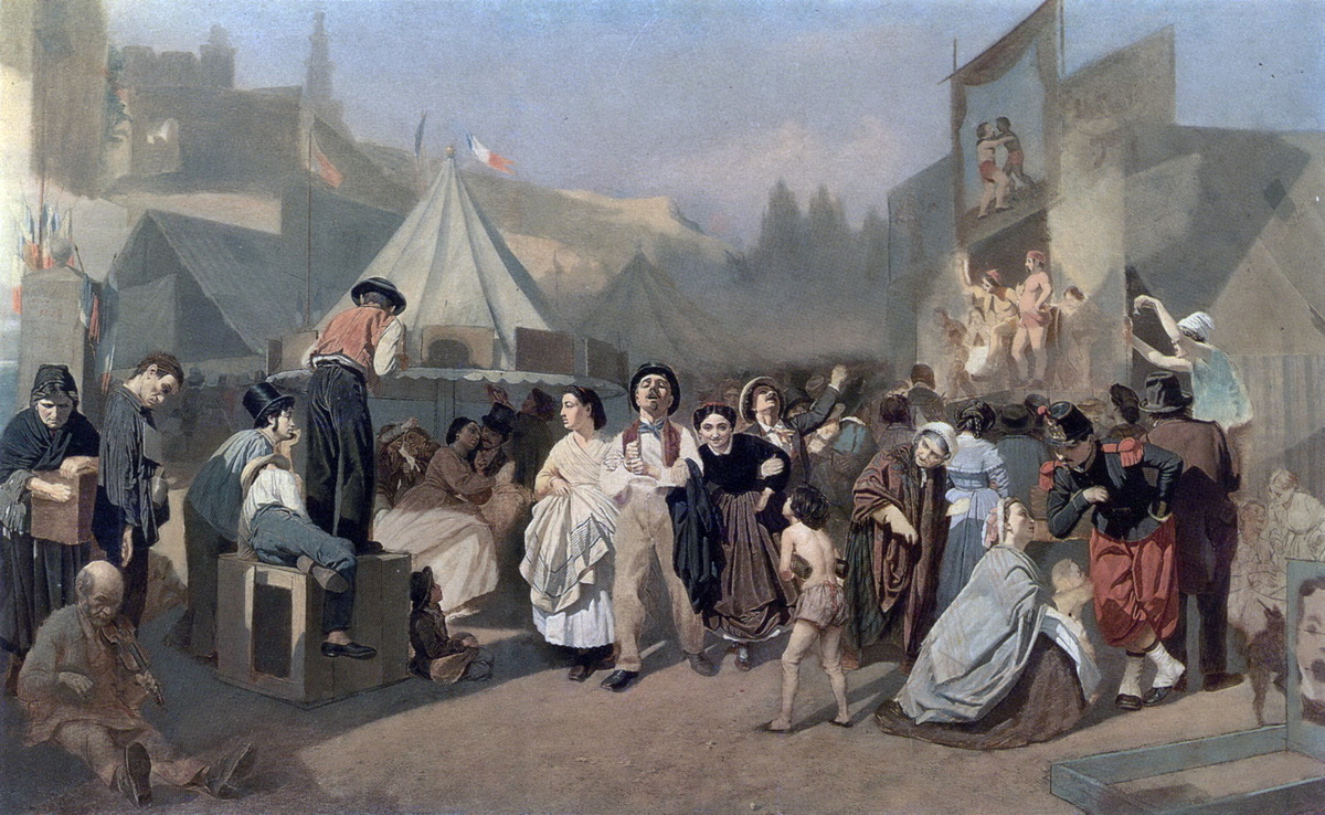 Искусствоведы разводили руками: “Бывает же такое!” Это просто индийское кино, Зита и Гита, разлученные в детстве и нашедшие друг друга по воле шутницы-судьбы. Только про картину. Но начнем по порядку. В начале шестидесятых годов прошлого века Василий Григорьевич Перов побывал во Франции. Художника всегда интересовали люди, их быт, горести и радости, в общем, жизнь в ее многообразии. И то, что Перов обратился к теме гуляний, уличных музыкантов и акробатов, объясняется прежде всего тем, что они бросились ему в глаза, когда художник бродил по Парижу в весенние и летние месяцы. В те времена они были неотъемлемой принадлежностью города в праздничные дни. Эти свои впечатления он воссоздал в серии ярких, красочных картин, одна из которых «Праздник в окрестностях Парижа» Полотно изображает оживленную сцену на ярмарке или празднике под открытым небом, проходящем в окрестностях французской столицы. Центральное место занимает группа людей, занятых различными делами и развлечениями– все они погру