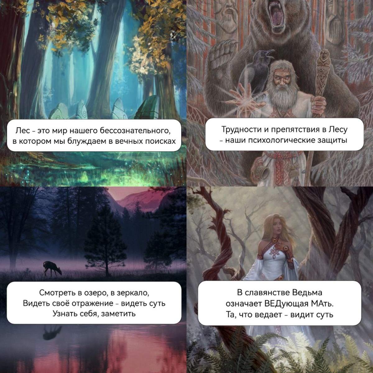 Что происходит на самом деле на метафорическом уровне в сказке КАК СИЯНА СЕБЯ УВИДЕЛА? Любому погружению в своё бессознательное, как правило, предшествует запрос. Должна быть причина, задача трудно разрешимая через привычные инструменты реальности. В сказке девушка подверглась заклятию - превратилась в призрака, которого никто не замечает. Быть неприметной, невидимой - актуальный запрос на проявленность в наше время. Не так ли? Но и подсказку Ведьма (сама Ведьма-то тоже неспроста появилась) героине дала - отыскать в самой гуще Леса Чистое Озеро: 🌲🌲🌲Лес в психотерапии и метафизике - наше бессознательное. И пойти туда, значит, обратиться к своей подсознательной части. 🧙🏻♀️ВедьМа - та, что подтолкнула девушку пойти в эту глубь, познать себя. В славянстве это положительный персонаж, ВедьМа - звание Ведающей Матери, той что видит суть, знает. В сказке метафорично может означать как проводника, в виде психолога, мудрого собеседника или специалиста помогающей профессии, так и образн