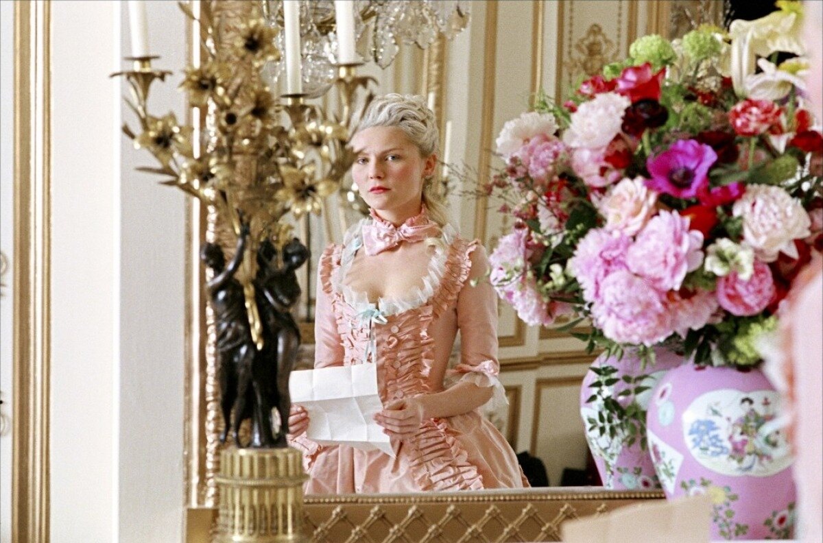Мария-Антуанетта - фильм о королеве-подростке, супруге последнего перед французской революцией короля Людовика XVI Конфетно-пастельная цветовая гамма фильма с интерьерами Версаля, в котором после революции ничего из исторического не уцелело. Все было воссоздано во дворце для туристов, восстановлено по текстовым описаниям. Важные детали: - Хрустальные люстры и светильники с подвесками, - Принты с садовыми цветами и растениями, - Резные позолоченные декоры.