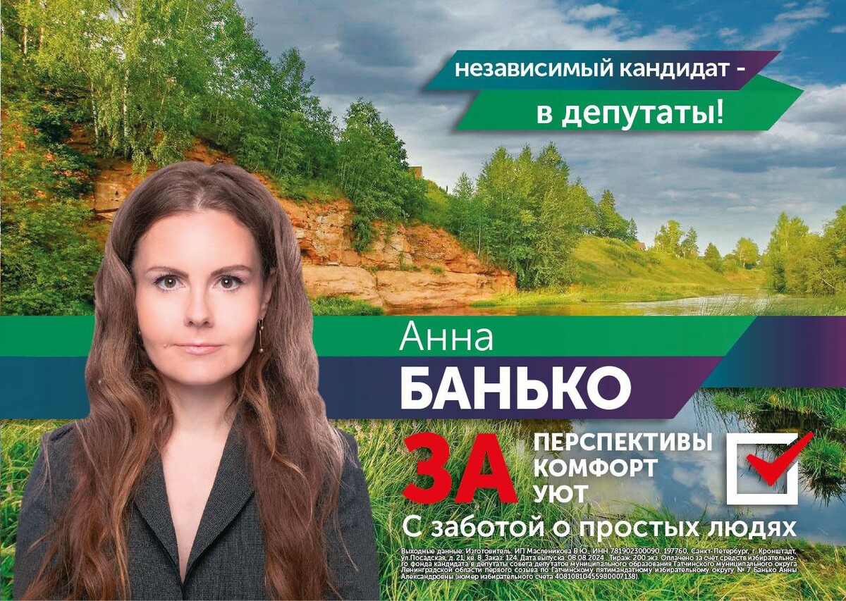 В 2024 году я решила баллотироваться как самовыдвиженец по двум округам. МО "Московская Застава" в Санкт-Петербурге, по месту нахождения проведения моей общественной работы в общероссийском движении по защите прав потребителей . Свою кандидатуру я так же выдвинула в 7 округе МО "Гатчинский", так как в 2023 году я продала квартиру, купила землю и построила дом в деревне Большево с полным намерением жить там семьей и заниматься ЛПХ.