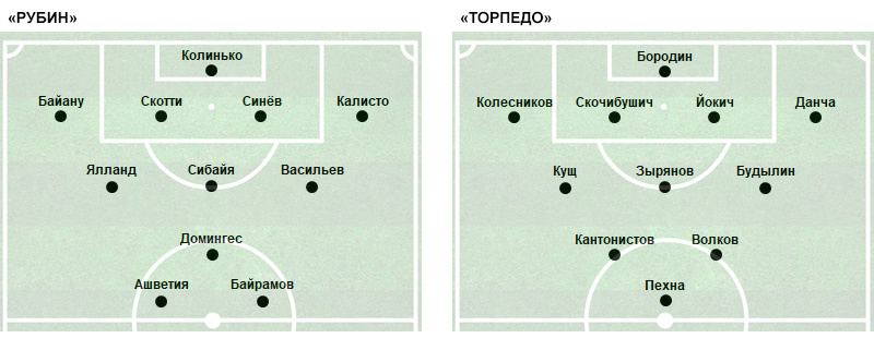 Победа над «Торпедо» выводила бы «Рубин» в лидеры чемпионата. Курбан Бердыев чуть изменил состав, который в пятницу обыграл «Томь», выпустив вместо Салуквадзе Байано, а Байрамова - вместо Базаева. У «Торпедо», которое лишилось из-за удаления Гейнриха, с первых же минут выходят Пехна, Будылин и Кантонистов, зато в запасе остаются Луценко с Кормильцевым. А вот опального Панова нет даже в заявке на матч дублеров…