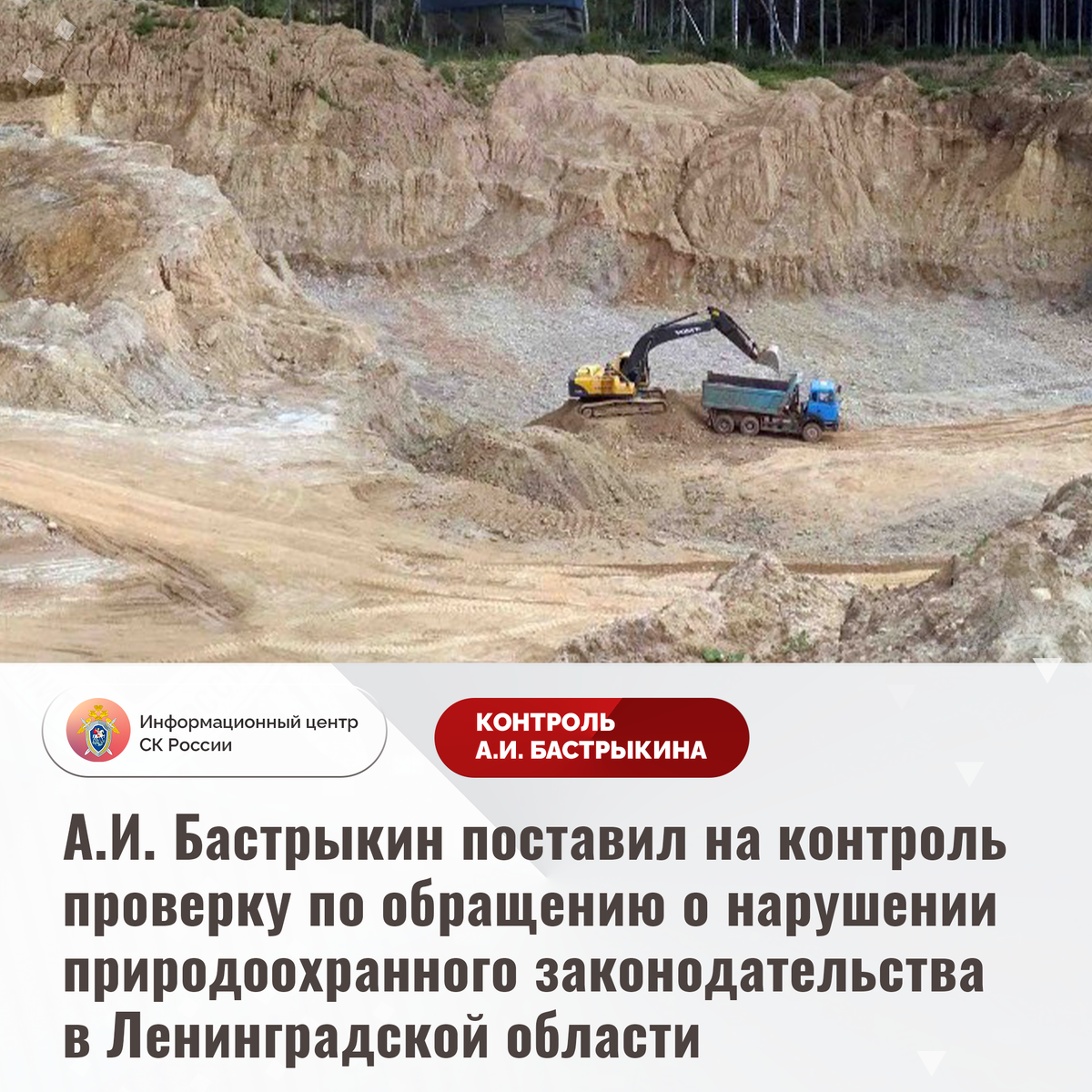 А.И. Бастрыкин поставил на контроль проверку по обращению о нарушении природоохранного законодательства в Ленинградской области На единую многоканальную телефонную линию Информационного центра СК России поступило обращение о том, что в карьере «Варшко-1» вблизи СНТ «Садко» в Ленинградской области в ходе производства работ по добыче песка и щебня не соблюдается режим тишины, пыль и песок в больших количествах проникают в дома. Отмечается, что в настоящее время активно производится вырубка деревьев для увеличения площади существующего карьера и разработки нового, что, по мнению жителей, создает угрозу нарушения экосистемы. Многочисленные обращения граждан результатов не принесли. Указанная ситуация освещается в СМИ и социальной сети. В СУ СК России по Ленинградской области по данному факту организована процессуальная проверка. Председатель Следственного комитета Российской Федерации Александр Иванович Бастрыкин поставил ход процессуальной проверки на контроль в центральном аппа