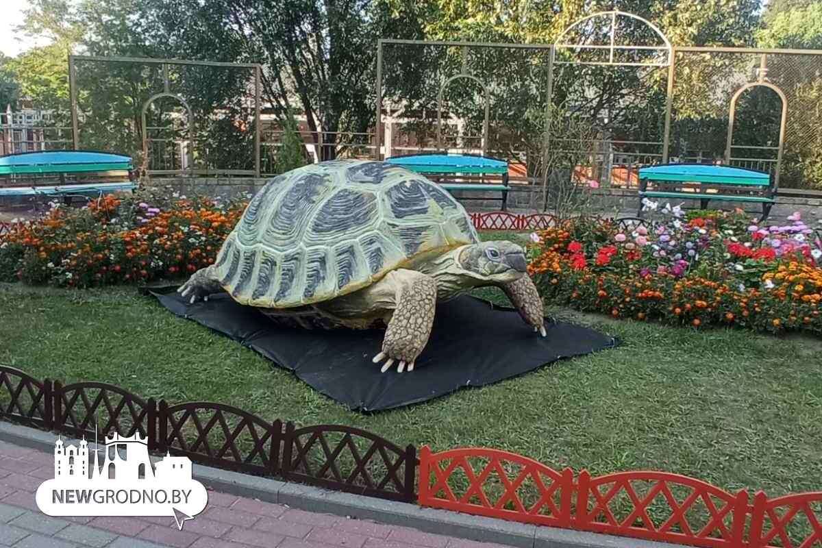 Сразу успокоим – бояться гиганта не стоит. Черепахой надо любоваться. Ведь это искусно изготовленная скульптура. С виду и не скажешь, что она сделана из бетона. Наоборот, черепаха выглядит живой и очень легкой. Но на самом деле ее вес – около 1 тонны. А размеры скульптуры достигают 3 метров. Изготовил черепаху известный гродненский скульптор Сергей Жильский. Вся работа, по его словам, заняла около месяца. Кстати, скульптор работает исключительно с бетоном. Несмотря на то, что материал изначально кажется грубым, у мастера получаются по-настоящему необычные и тонкие вещи. Дерево или цветы, например, всегда выглядят натуральными. Кстати, скульптор даже разработал несколько собственных рецептов бетона. Работы Сергея Жильского известны далеко за пределами Гродно. Эти летом, например, созданная им скульптура сказочной девушки переехала на родину белорусской Снегурочки в один из санаториев Брестской области.