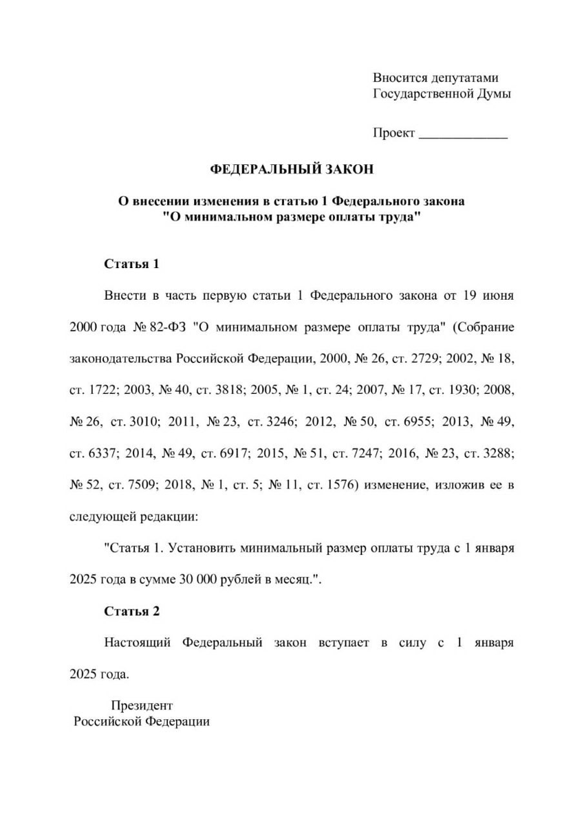 Сегодня Минимальной размер минимальной оплаты труда (МРОТ) составляет 19 242 рубля. Если предложенный депутатами законопроект получит поддержку, то уже начиная с 1 января 2025 года работодателям придётся поднять оклады работников, получающих минимальные зарплаты (таких у нас больше 5 миллионов человек) сразу на 10 758 рублей. Более чем в полтора раза (если быть точным – на 56%).