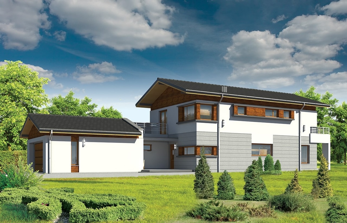 Одноэтажная гаражная часть вынесена перед основным корпусом здания и соединена с основным домом коридором.