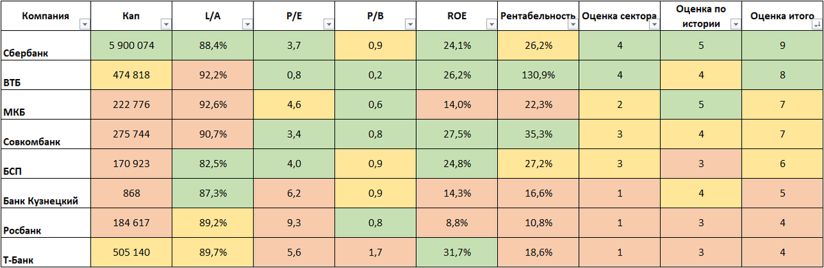 Небольшая сравнительная табличка финансового сектора, а именно банковской отрасли. Сравнение исключительно по мультипликаторам и показателям по сектору и историческим данным (последние 5 лет + текущее полугодие) Итак. Максимальное кол-во баллов 12. От себя добавлю: Сбер - после коррекции выглядит очень привлекательно, и даже дешево. По 250 и ниже, уже можно сказать, будет "распродажа". ВТБ - только для тех, кто готов ждать, страдать и ждать. МКБ - приятно удивлен такой высокой оценкой. Т-Банк (он же бывш. ТКС) - разочарование.
