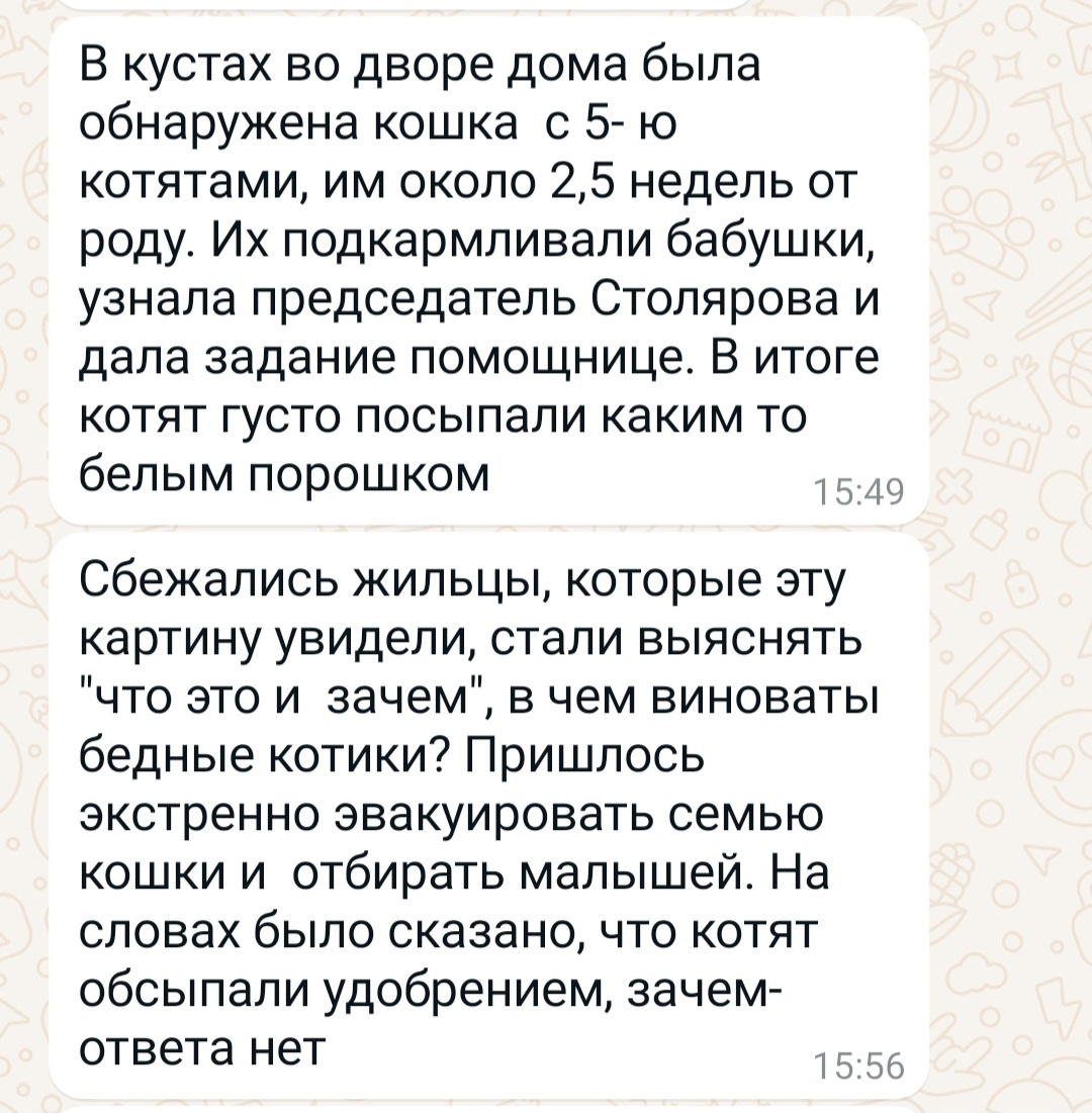 Начало истории тут. Жители дома, поняв что у них есть поддержка извне, что в целом дает возможность им разделить ответственность. А штрафы, которыми их пугает тов. Столярова, на меня она не наложит. Если только обратится в суд о защите чести и достоинства, но тогда ей придется опровергать мою информацию, бремя доказывания будет лежать на ней, как и любом гражданском процессе. Хотя, процесс был бы интересный. Но я не удовлетворю свое любопытство, не позволят ей инициировать судебное разбирательство, ибо процесс будет очень громким. У меня был подобный судебный процесс, по содержанию дорог, власти тоже не захотели огласки и бюджетное учреждение быстренько, после первой инстанции, заплатило по исполнительному лису, без необходимых обжалований решения суда. Жители написали мне об отравлении кошек. Вот скрины: Зачем посыпать кошек удобрениями? Что за детский лепет? Бедная кошка, даже на фото видно, что она облизывает своего отравленного котенка. Кстати, мертвые голуби, которых я лично