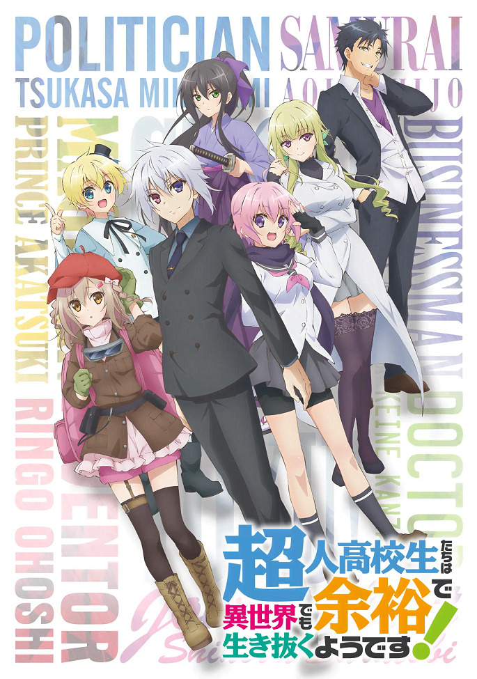 Choujin Koukousei-tachi wa Isekai demo Yoyuu de Ikinuku you desu! Семь японских старшеклассников пользуются международной известностью благодаря своим выдающимся талантам. Всемирно известный врач Кейн Кандзаки, премьер-министр Цукаса Микогами, гениальный изобретатель Ринго Охоси, профессиональный журналист и в придачу ниндзя Синобу Сарутоби, лучшая в мире мечница Аой Итидзё, опытный иллюзионист Принц Акацуки и мультимиллионер Масато Санада. Однажды они попали в авиакатастрофу, а очнувшись, поняли, что находятся в совершенно другом мире — мире магии и зверолюдей. Быстро развивающийся сюжет. Довольно интересные, пусть и шаблонные персонажи. Простенький и местами топорный сюжет. В серьезность некоторых сцен, просто не веришь. Тяжело описать конкретные минусы, все такое среднее, без души. Аниме про попадание в другой мир мы уже видели, а что если главных героев будет 7 ? Хотя основой все же есть. У авторов получилось нормальное, такое очень среднее аниме, особо не запоминающиеся, но и отт