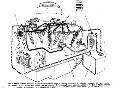 насосом и автоматической муфтой опережения впрыска, форсунок, фильтров грубой и тонкой очистки, топливопроводов низкого и высокого давления (рис. 22).