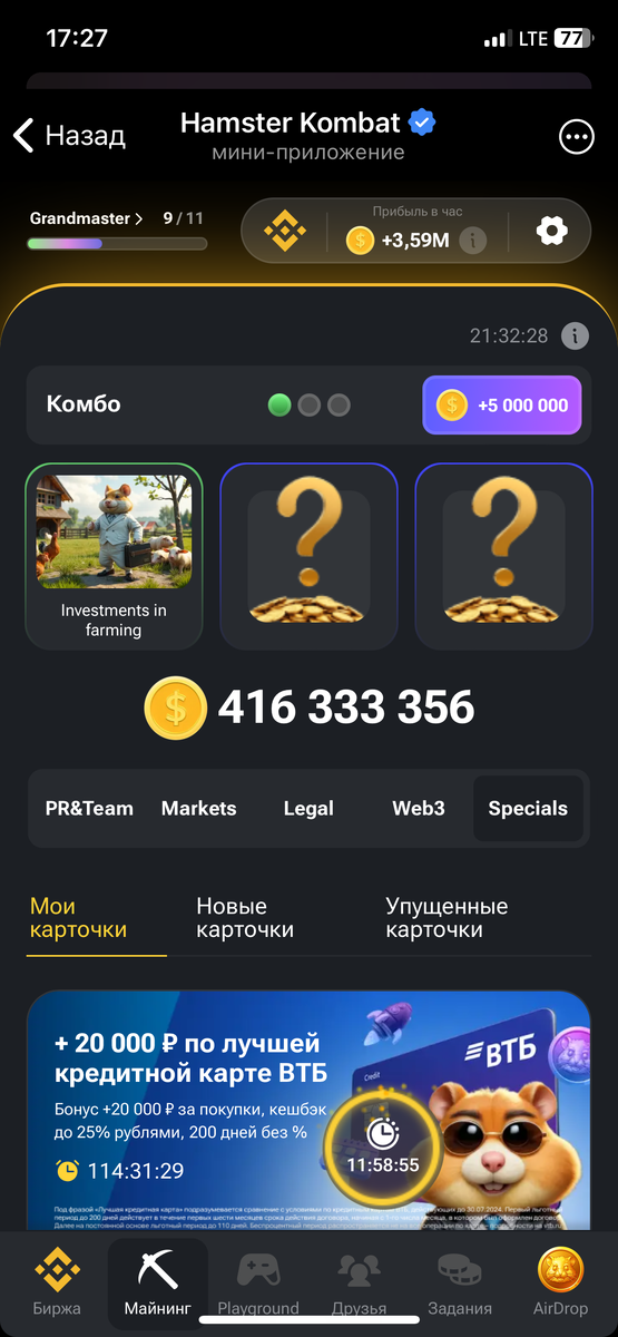 Криптовалютный кликер Hamster Kombat, запущенный в Telegram в марте этого года, за три месяца после запуска набрал 239 миллионов пользователей. Ежедневно к игре присоединяется 4-5 миллионов новых пользователей, что сделало ее чрезвычайно популярной. В настоящее время в ней можно зарабатывать криптовалюту Hamster Coin, которую можно будет конвертировать в реальные активы после листинга токена. Игра также генерирует доход за счет рекламы партнеров и реферальных выплат. Листинг токена Hamster Kombat (HMSTR) запланирован на 26 сентября, после чего состоится AirDrop. Официального списка бирж, которые будут участвовать в листинге, пока нет, равно как и подробностей о том, что будет предложено инвесторам во время листинга. Присоединиться к игре