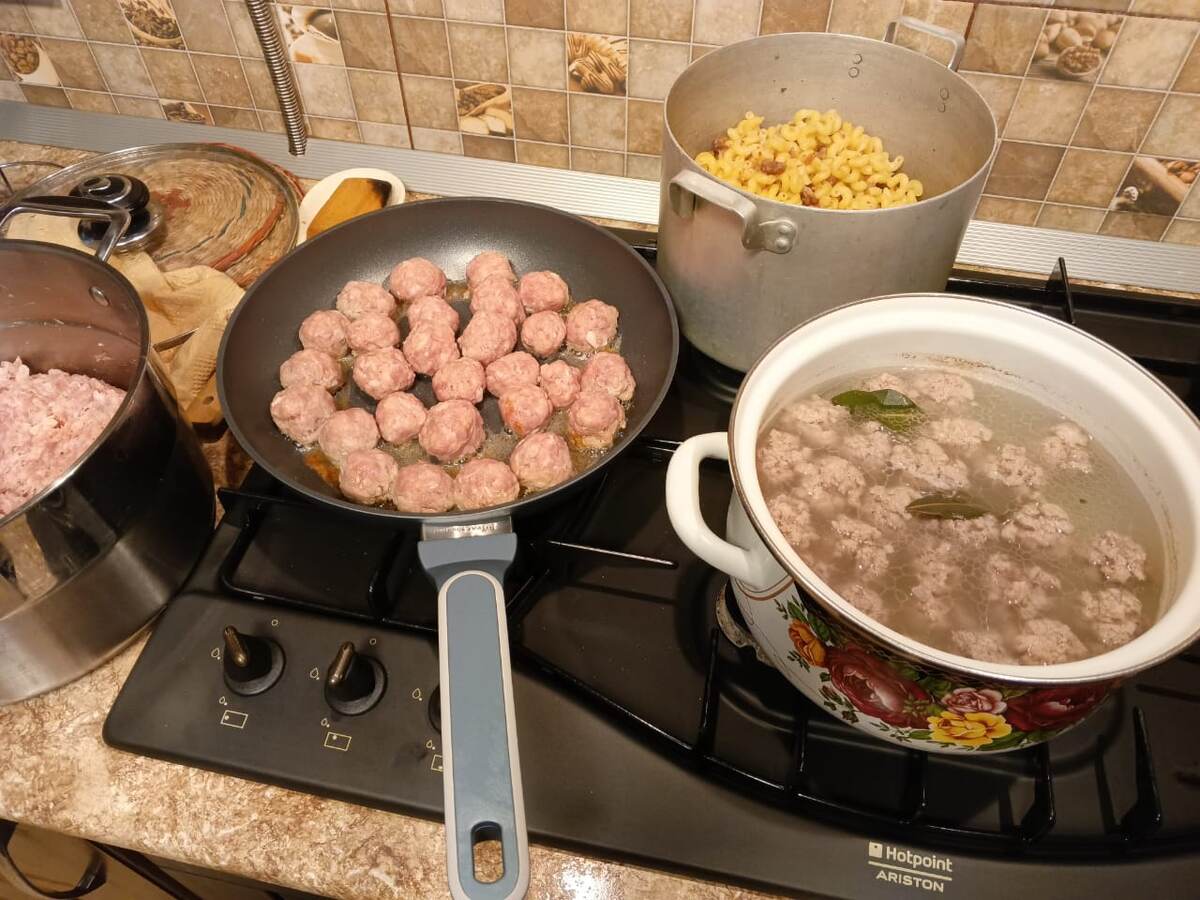 Первым делом приготовили еду. Плита шикарная. 6 комфорок. Мы из дома в сумке-холодильнике довезли фарш из свойской свинины.