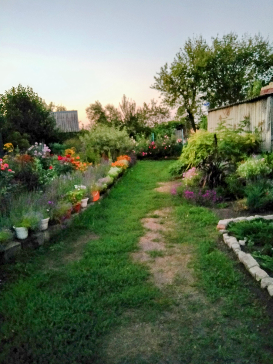 Приветствую вас, друзья мои. Осенью у нас конечно не пахнет, жара, сушь и следующая неделя жаркая будет. Но сад в ожидании осени, тихий спокойный, без взрывов красок, не считая роз, началось второе цветение и скажу вам, не плохое, но о розах поговорим в отдельной статье. А сегодня всего и по немногу. Вчера зять скосил проход, теперь тут чисто, моя равнина ещё цветёт. И розы тоже, снимки делала вечером, днём очень яркое солнце. Накогец то зацвёл квамоклит, ох и тугодум он, всходит долго, растёт медленно, но забор уже заплел и активно зацвёл. Зелёный уголок оттеняет просо африканское или пенисетум. Плоскогооье моё тоже расползается в разные стороны. Вопрос к знающим, как формировать польский можжевельник? Зацвел горец, посадка этого года. Еще цветут гвоздики, надеюсь будет самосев. Ну эту красоту на новом участке всё видели, не перестаю удивляться клещивене, всё ввысь рвётся. Горка сейчас спокойная, особого внимания не требует, кроме полива. Астильбы давно отцвели, но акцен