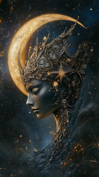 Селена, часто изображаемая как спокойная и сияющая фигура, является греческой богиней Луны. В древней мифологии она представлена как едущая на колеснице, запряженной двумя прекрасными лошадьми, освещая ночное небо своим мягким, серебристым светом. Дочь титанов Гипериона и Тейи, и сестра Гелиоса (Солнца) и Эос (Зари), Селена занимает важное место в космическом порядке.