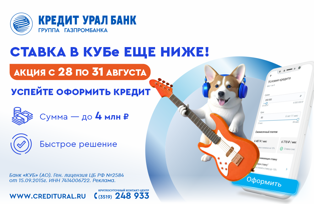 Есть такая примета: снижение ставки в КУБе — это к деньгам! Чтобы примета сработала, прямо сейчас оформите кредит наличными. До исполнения любой заветной мечты вас отделяет только одна заявка на кредит в интернет-банке: 🔹 сумма кредита — до 4 млн ₽, срок — до 7 лет. 🔹 перечислим деньги через 15 минут после подписания договора. 🔹 минимум документов, быстрое решение по кредиту и круглосуточная поддержка без роботов. Акция действует с 28 по 30 августа. Подробная информация об условиях акции — во всех отделениях, на сайте Банка и по телефону круглосуточного Контакт-центра: +7 (3519) 248 933.