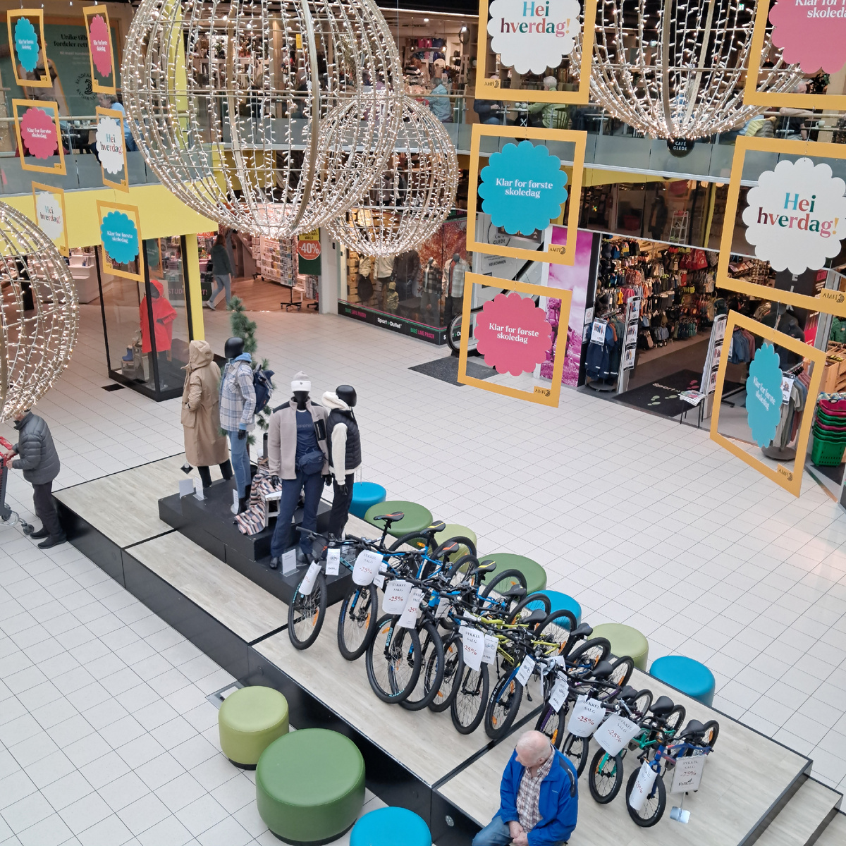Осенние витрины и покупатели норвежского торгового центра АМФИ