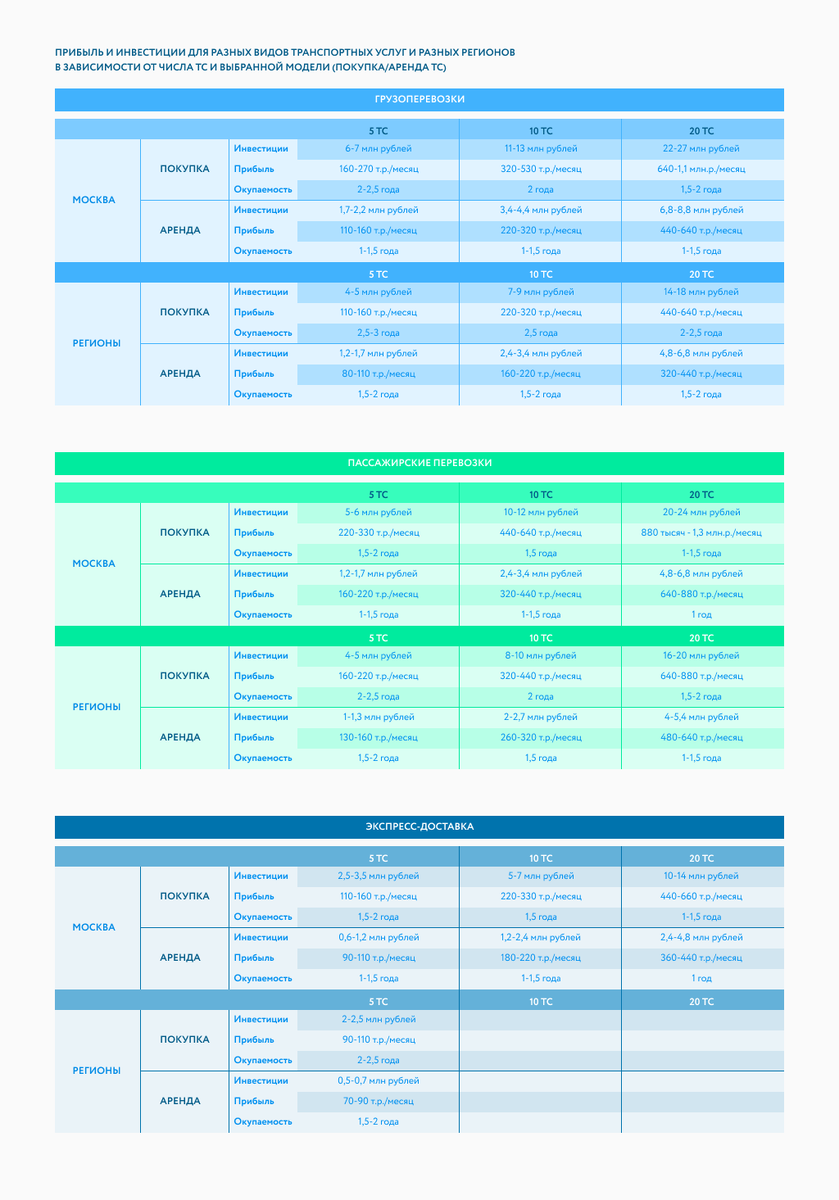 Меня зовут Кеслер Илона, я — Директор по маркетингу Первого ОФД. В этой серии статей я делюсь своей и экспертизой компании в части открытия бизнеса в разных нишах. В этой публикации приведу расчеты инвестиций для старта транспортного бизнеса и то, как быстро они окупятся. Пару слов о Первом ОФД Мы помогаем предпринимателям закрывать под ключ задачи, связанные с кассами, товарным учетом, аналитикой, электронным документооборотом, обязательной маркировкой. Но основной наш продукт - это сервис передачи фискальных данных (ОФД). Данные, с которыми работает ОФД, охватывают всю информацию о продажах, произведенных через кассы и отраженных в кассовых чеках. Первый ОФД ежедневно передает в ФНС более 30 млн. чеков с 495 000 касс из торговых точек по всей России. Таким образом наша аналитика основана на 20% всех продаж российского ритейла (включая Крым). Эти данные мы используем в обезличенном виде для анализа потребительского поведения и определения трендов покупо