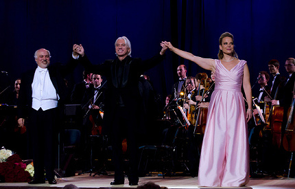 Элина Гаранча и Дмитрий Хворостовский спели «концерт дружбы» в Кремле Имя Дмитрия Хворостовского в нашей стране знаковое: популярность артиста велика, каждый его приезд в Москву подобен визиту кумира шоу-бизнеса – яркие постеры и билборды по всему городу, шумная реклама в СМИ и астрономические цены на билеты. Карьера певца развивается на Западе, но на родину он приезжает нередко, выступая преимущественно в столицах и родном Красноярске. Нынешний визит – особый, приковавший к себе внимание всех: в конце июня Хворостовский отменил свои выступления в связи с тяжелым заболеванием, но, пройдя курс лечения, уже в сентябре возобновил оперную карьеру, спев в «Трубадуре» на сцене нью-йоркской «Метрополитен-оперы», а в октябре выступив несколько раз и в Москве. Встреча ожидалась с трепетом – каков он теперь, любимый певец, как держится, как выглядит, в какой вокальной форме? Циклопический зал Государственного Кремлевского дворца был заполнен до отказа, и артист не обманул ожиданий своих поклонни