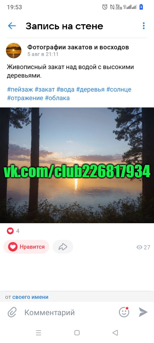 Насладитесь живописным закатом над водной гладью, обрамленной высокими деревьями.