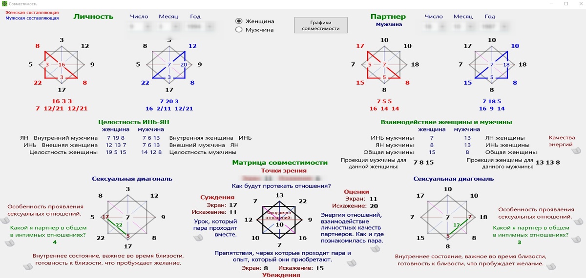 Не познав себя, не узнав партнёра, мы создаём иллюзии. Но свойство иллюзии, в один прекрасный момент, разрушиться. Чем сильнее полёт эйфорийной влюблённости, тем сильнее падение в депрессию, вплоть до нежелания жить... А что если мы заранее просмотрим все острые углы отношений, и вместо бессознательных чувств, войдём осознанными и сознательными? В зеркальной матрице тему отношений мы, можно сказать, разобрали по "косточкам". Посмотрите на скриншот из калькулятора. Начиная с базового анализа по энергиям матрицы, с запросом "какой партнёр мне подходит", завершая более глубокой совместимостью ИНЬ-ЯН. В матрице присутствуют инь и ян структуры для мужчины и для женщины. Специальный расчёт позволяет увидеть по энергиям совместимость пары на основе потоков инь и ян, понять их особенность и взаимодействие. И также, на что обратить внимание, ч