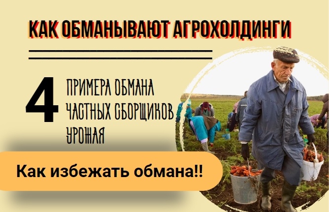 В этой статье мы рассмотрим, как агрохолдинги обманывают частных сборщиков урожая и коснёмся именно наёмных работников (физ.лиц и ИП). Агрохолдинги используют различные методы для привлечения работников на уборку урожая, предлагая высокие зарплаты и комфортные условия труда. Однако после подписания договора и начала работы оказывается, что обещанные условия не соответствуют действительности, а зарплата выплачивается только частично или не выплачивается совсем. Вот несколько примеров обмана, с которыми сталкиваются частные уборщики урожая: Чтобы избежать обмана со стороны агрохолдингов, частным уборщикам урожая следует: Обман со стороны агрохолдингов может привести к серьёзным финансовым потерям для частных сборщиков урожая. Поэтому важно быть внимательными и осторожными при выборе работодателя и заключении трудового договора. Если ты уже столкнулся с такой проблемой, пиши в комментариях название холдинга, не дай обмануть других! Мы обязательно рассмотрим в другой статье проблему частны