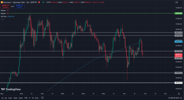 Всем привет, свежий обзор биткоина. Биток снова опустился ниже отметки в 60 000 долларов, что конечно же не очень хорошо Привет, меня зовут Антон Степанов и я рассказываю о сложном мире криптовалют простыми словами, чтобы каждый читающий мог понять суть этой сферы Если ты в начале пути и только начинаешь знакомиться с биржами, то от себя порекомендую биржу BingX. BingX сейчас активно выходит на русский рынок и одним из главных плюсов является то, что у биржи достаточно низкие торговые комиссии Также, у меня есть прямой контакт с менеджментом биржи BingX и при возникновении каких-либо спорных вопросов вы можете напрямую обращаться ко мне! Зарегистрировавшись по ссылке ниже, вы так же получите % скидку на комиссию и множество других бонусов 👇🏻 👉🏻 Зарегистрироваться 👈🏻 Локально откатились немножко, снизу у нас есть зона поддержки, она довольно-таки широкая от 57 600 и, собственно, вверх до 60 000 долларов. Вот эта зона в целом для нас является хорошим лонг-уровнем. Вопрос удержит он