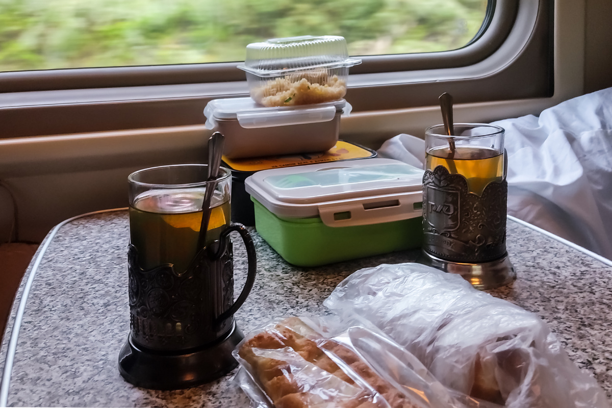 Да, есть то, что выгодно отличает поезд от других видов транспорта: прежде всего это отсутствие ограничений на багаж, возможность взять с собой любую еду и питье (а потом их разогреть), наличие розеток у каждой полки, столики для еды...