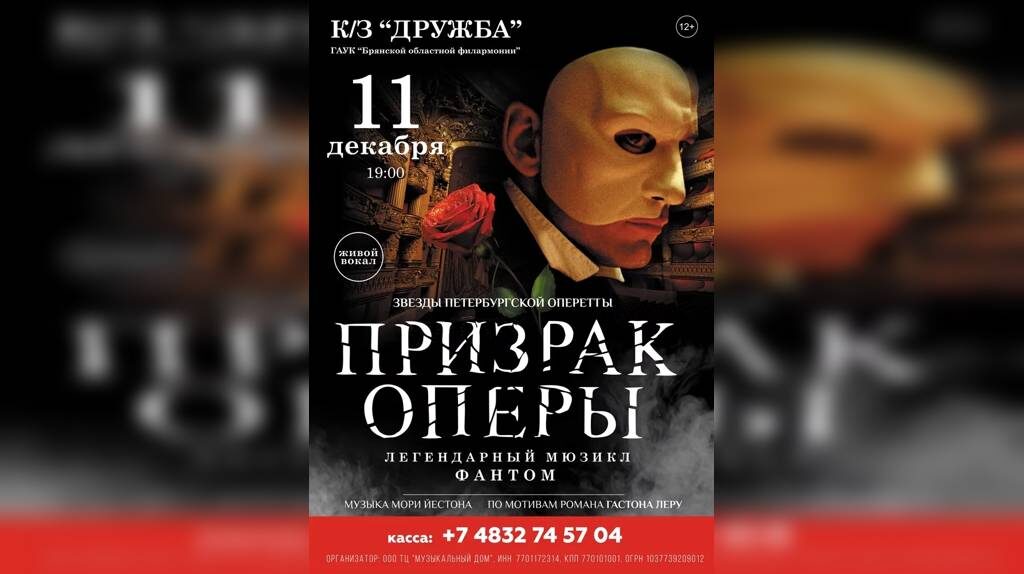 11 декабря на сцене Брянской областной филармонии пройдет легендарный мюзикл "Призрак оперы". Начало в 19 часов. Этот спектакль о жизни, любви и смерти Эрика, фантома, призрака театра «Парижская опера» во многом отличается от романа Леру «The Phantom of the Opera» ( «Призрак Оперы») и одноименного бродвейского мюзикла на музыку Ллойда-Уэббера. В музыке Мори Йестона слышны отголоски оперетт, она вызывает ассоциации со старыми американскими музыкальными фильмами.