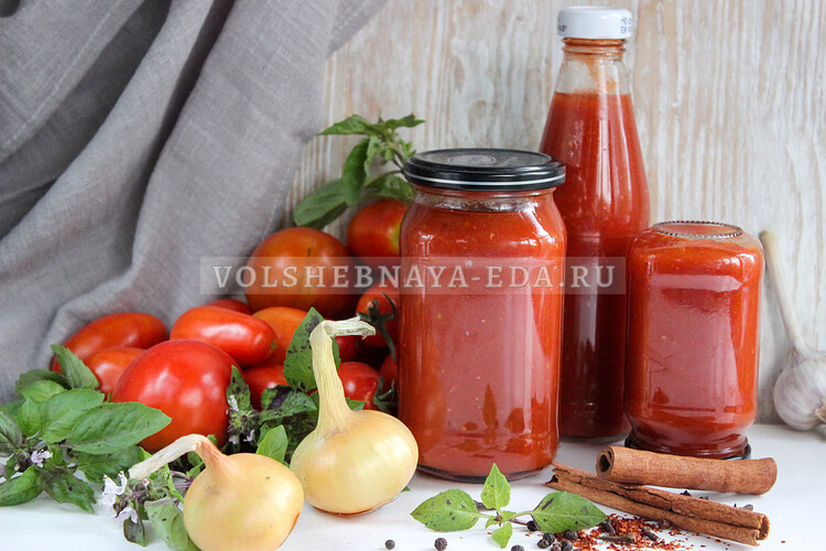 Выход: 2 л | Калорийность: 34.14 Томаты промыть, дать стечь лишней воде. Крупные плоды разрезать пополам, чтобы прошли в раструб мясорубки. Если имеются какие-то подпорченные места, то их тоже попутно срезать. Луковицы и чеснок очистить от шелухи. Пропустить все подготовленные овощи через мясорубку с крупной решеткой. Электромясорубка стравится с задачей за 5 минут. В итоге получится полная 5-литровая кастрюля (выбирайте широкую, чтобы влага быстро выкипала). Поставить на огонь кастрюлю и подождать, пока закипит. Варить 1 час при слабом побулькивании — без крышки, чтобы уходила влага, время от вре