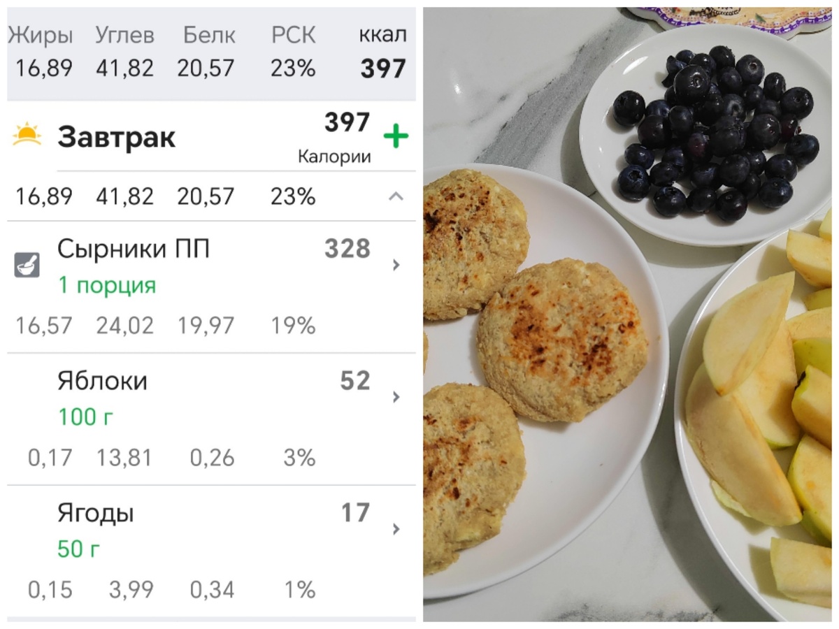 Сегодня на завтрак сырники из овсяной муки и яблоки.