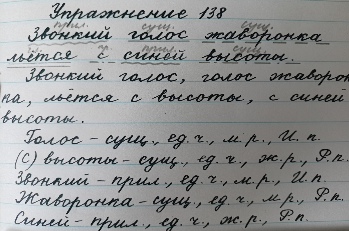 1. Проверка домашнего задания. Упражнение 135. Дети читают придуманные предложения. Самые лучшие записываются на доске. 2. Сбор тетрадей с д\з. Выдача проверенных тетрадей. Работа над ошибками. 3. Объявление темы урока. Сегодня вы будете работать самостоятельно, чтобы мы проверили, как вы научились писать окончания прилагательных в единственном числе. Но для разминки поработаем вместе. Упражнение 138. Запишем предложение: Звонкий голос жаворонка льётся с синей высоты. Разберём его по членам и частям речи. Выпишем словосочетания: сколько второстепенных членов, столько и словосочетаний. Сделаем морфологический разбор имен существительных и прилагательных: 4. Проверочная работа. 1 вариант выполняет упражнение 137, 2 вариант - упражнение 139. Нужно списать предложения, выделить окончания прилагательных и обозначить их падеж. Работа выполняется в тетрадях для контрольных работ. 5. Домашнее задание. Упражнение 139 стр. 43. Написать по пять существительных на шипящую 2-го и 3-го склонения.
