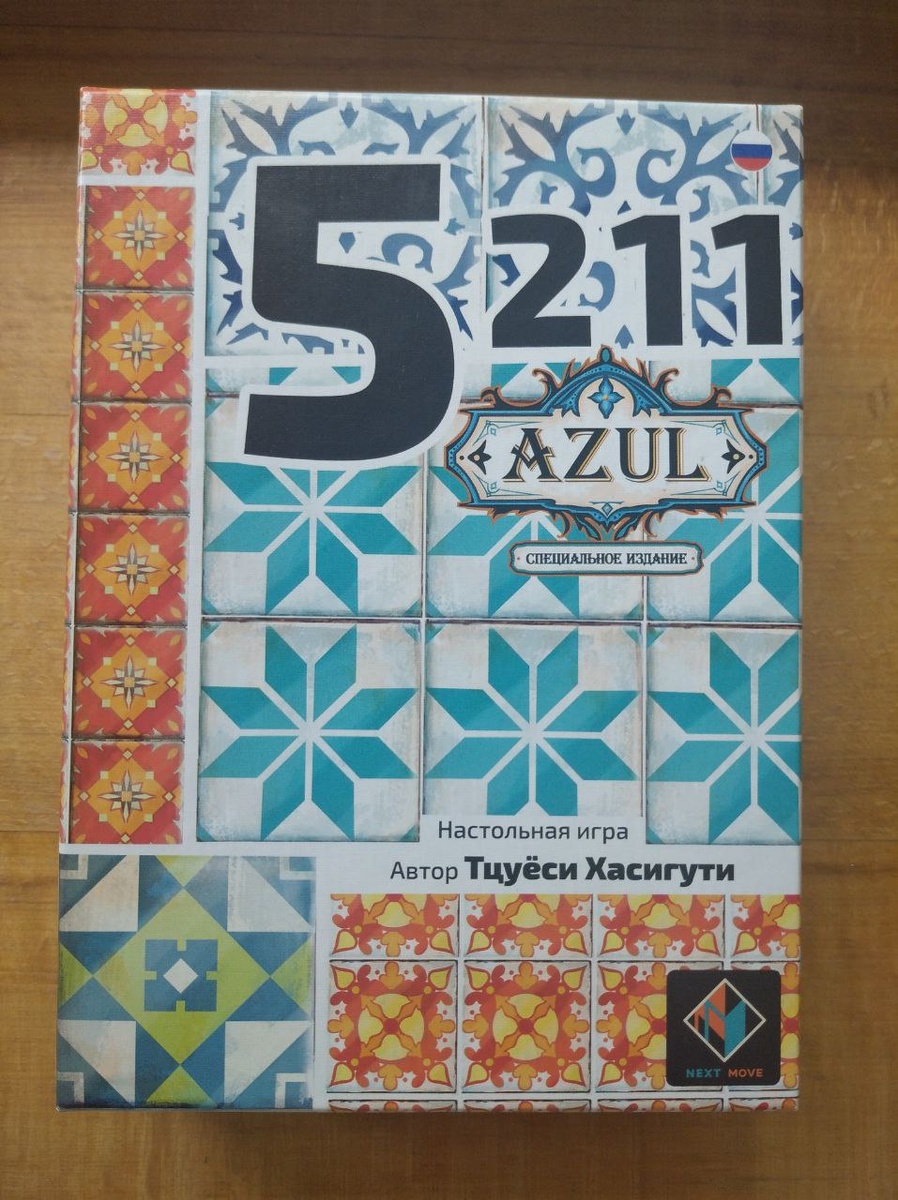 Настольная игра 5211. Карточная игра в названии которой можно прочитать правила игра: на руках 5 карточек. Сначала выкладываются 2 карты и потом по 1-ой карте. Оригинальная игра 5 Colors выпущена в 2017г. В последующем игра переиздавалась под другим названием и в другом дизайне. В России игра издается под названием 5211- Azul, издательство Next move. Игра состоит из 100шт карточек (по 20 штук каждого из 5-и цветов). Карточки значениями от 1 (это петушки) до 6-и. Значение цифр - это победные очки. Каждому игроку раздается по 5 карточек. Раунд состоит из трех частей. В первой части игроки одновременно выкладывают по две карточки рубашкой вверх и раскрывают их. Затем добирают из колоды карты себе в руку до 5-и штук. Во второй и третьей части происходит тоже самое, но игроки уже выкладывают по одной карте. После этого происходит подсчет победных очков следующим образом: Если игроки суммарно выложили количество карточек петушка равное или большее количеству игроков +2, то в этом раунде ПО