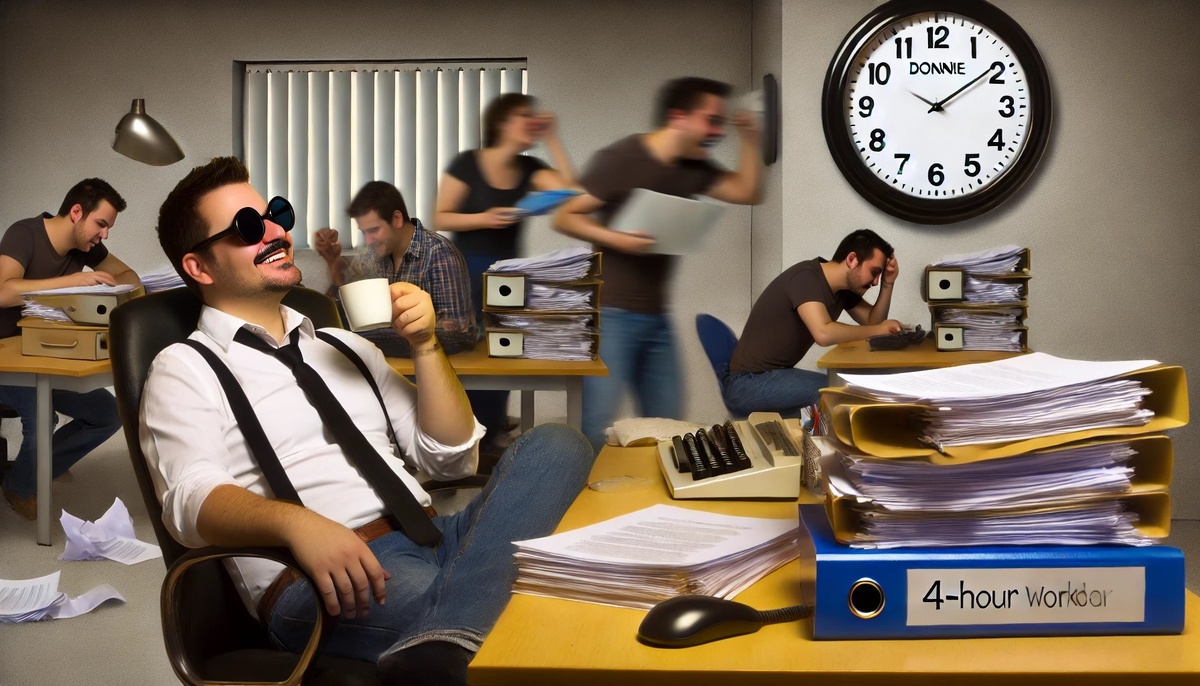 Дони сидел за своим столом и ощущал, как жизнь медленно утекает сквозь пальцы. Рабочий день начался в 9 утра, и вот уже стрелки часов приближаются к 6 вечера, а он даже не дотронулся до самого важного проекта. Кажется, сегодня опять «плодотворный день», когда он крутился, как белка в колесе, и в итоге нифига не успел. Почта, мессенджеры, бесполезные совещания, а важные дела, как обычно, остались на потом. На потом, которое так и не настало. 🐭 Каждую неделю та же фигня: понедельник начинается с планов, пятница заканчивается выгоранием и разочарованием. Зачем столько работать, если в итоге ты ничего толком не сделал? Дони был в ярости. Он чувствовал себя, как хомяк, который бегает в колесе без остановки, но так и не сдвигается с места. 😤 Однажды Дони, отчаявшись изменить что-либо в своей жизни, наткнулся на статью о «4-х часовом рабочем дне». «Что за чушь?» — подумал он сначала. «Кто вообще работает только 4 часа и при этом всё успевает? Это какой-то бред!» Но интерес взял верх, и он р