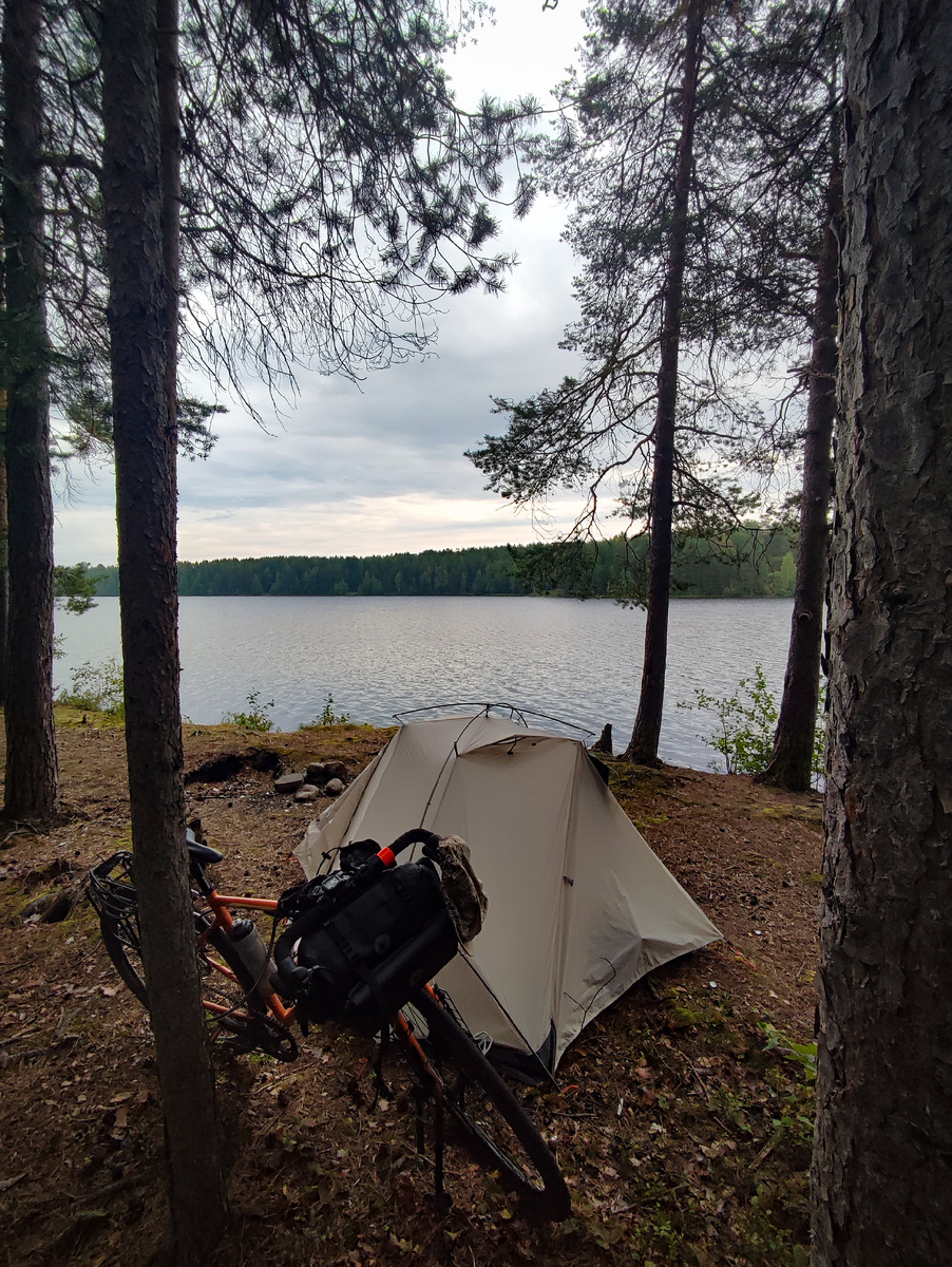 День начинался неспешно. Уже рассвело, но стоял какой-то полумрак. Хмурое небо временами сыпало мелкие капли на мою палатку. Волны всхлипывали где-то под берегом,вытачивая его и заливаясь под самые корневища прибрежных деревьев. И деревья эти на самом краю будто стояли на цыпочках, а то и вовсе висели над водой вместе с корнями и почвой поросшей моховицей. Небольшой ветерок был, но как будто впервые он сегодня дул не навстречу. Пока я завтракал, он стянул мелкую морось с палатки и тратить время на сушку не пришлось. Солнце так и не показалось. Первые километры от села Надвоицы я ехал по пустынной второстепенной дорожке с великолепным покрытием, волнистой и изворотливой. Дальше выехал на трассу её полотно вытянулось и рельефов стало меньше. Пасмурно и едется легко. После первой половины пути остановился пообедать в беседке за селом Пушной и обнаружил, что позабыл купить хлеб. Пообедал пряниками с огурцами и печоночным рулетом. После Пушного пара десятков километров была абсолю