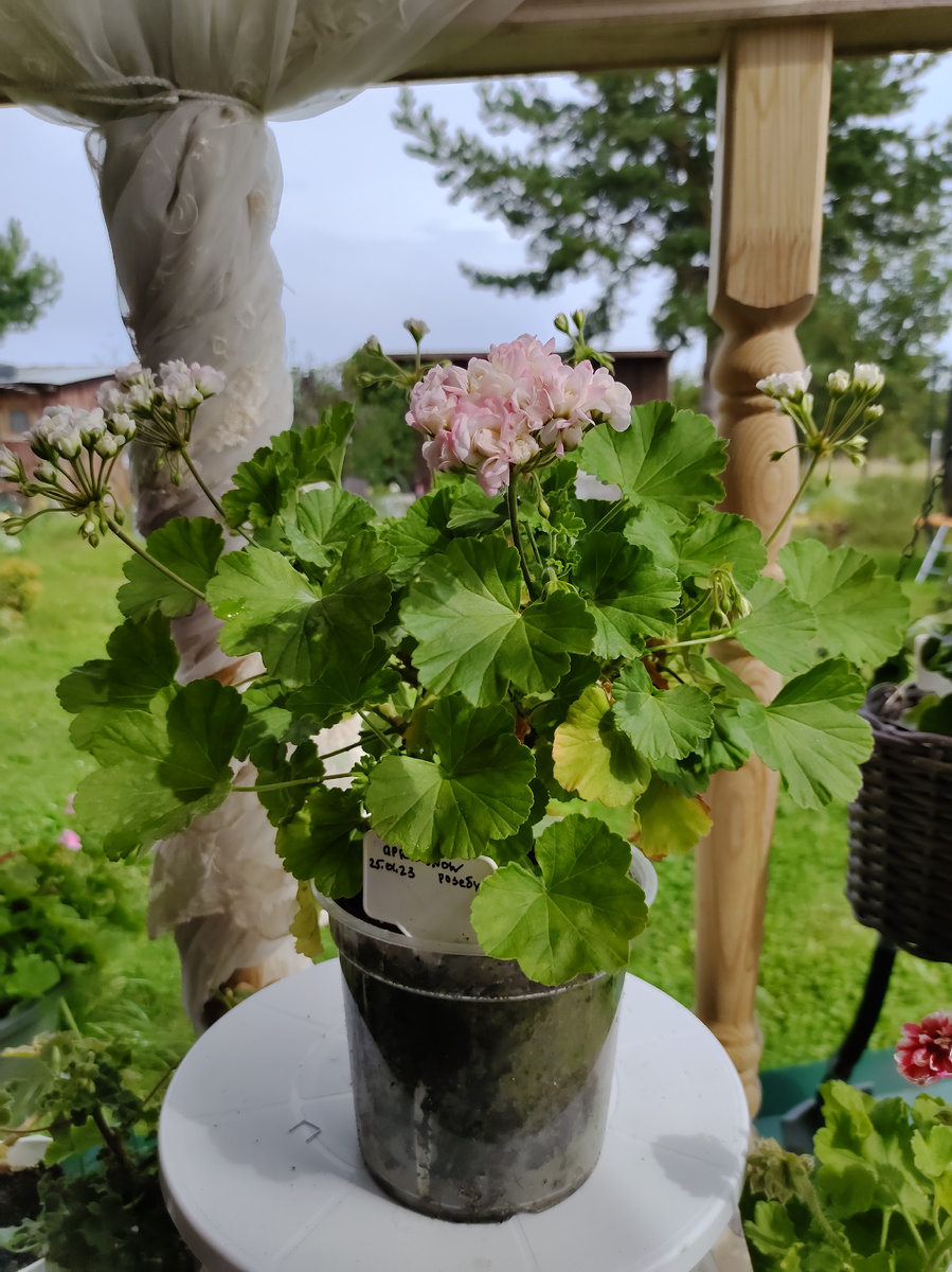 10 сорт в коллекции. Зональная, розебудная. В этом сезоне она выглядит совсем по другому. Если в прошлом году это был маленький, но цветущий росточек, в этом году это достаточно большой, выше 20 сантиметров, куст с большим количеством цветоносов, больше 20 штук. Кустик был острижен осенью, получился ровным, растет сейчас в 1 литре и больший объем ей, на мой взгляд, ей не нужен. Несмотря на то, что растение расположено практически на том же месте, что и прошлым летом, цветки не так ярко окрашены. Но выглядят очень нежно и трогательно. Красивая и нежная розебудная пеларгония. Сейчас, имея в коллекции крупноцветковые пеларгонии, на мою April Snow я смотрю более требовательно и цветочки мне кажутся мелковатыми. Каждый размером около 2-3 сантиметров. Давайте сравним с Звезда Водолея например. Преимущество Звезды для меня очевидно. Учитывая, что горшок одинаковый, Эйприл Сноу второгодка, расцветка похожа, я думаю, что April Snow все таки покинет мою коллекцию пользу более крупноцветково