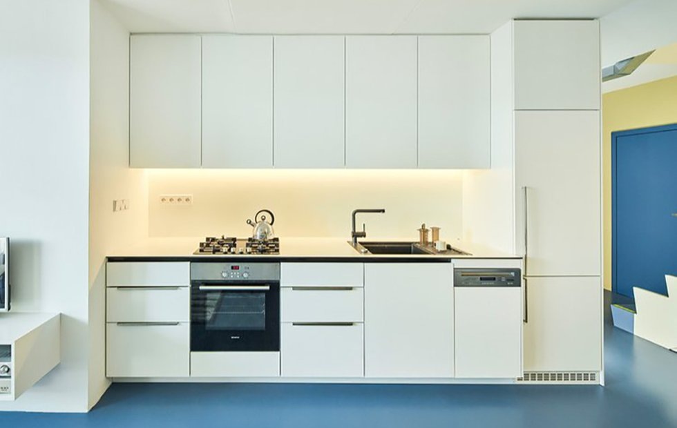 Главное место в квартире занимает просторная гостиная, объединенная с кухней. Здесь дизайнеры решили не прятать электрическую проводку, а сделать её видимой, что придало помещению индустриальный стиль. Пол из непрерывного полиуретанового покрытия проложен во всех комнатах, создавая единое пространство. Оригинальные стеновые панели были покрашены без штукатурки, что оставило видимыми их грубость и несовершенства, добавляя комнате характер.