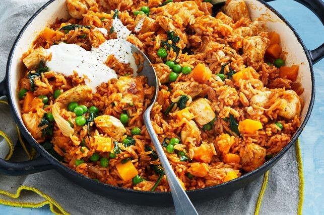 Я использовал томатную пасту как разумный и экономичный вариант для придания вкуса, насыщенности и цвета. Используется немного томатной пасты, поэтому вы можете сохранить остаток для использования в другом блюде. Чтобы увеличить потребление овощей и еще больше сократить расходы, я заменил часть курицы тыквой и горошком. Вместо того, чтобы подавать с рисом, я превратил карри в плов, что помогает еще больше растянуть трапезу. Это также экономит время на мытье посуды! Рецепт может содержать дрожжи, сульфиты, сельдерей, молоко и древесные орехи. Нагрейте 1 ст. л. масла в большой сковороде с толстым дном на среднем огне. Добавьте 500 г филе куриной грудки, нарезанного на кусочки толщиной 2 см и готовьте, периодически помешивая, в течение 3–4 минут или пока она не подрумянится и не прожарится. Добавьте 80 мл (1/3 стакана) соуса для тушения и перемешайте до однородности. Переложите в жаропрочную миску и накройте крышкой, чтобы сохранить тепло. Протрите сковороду насухо. Нагрейте оставшееся