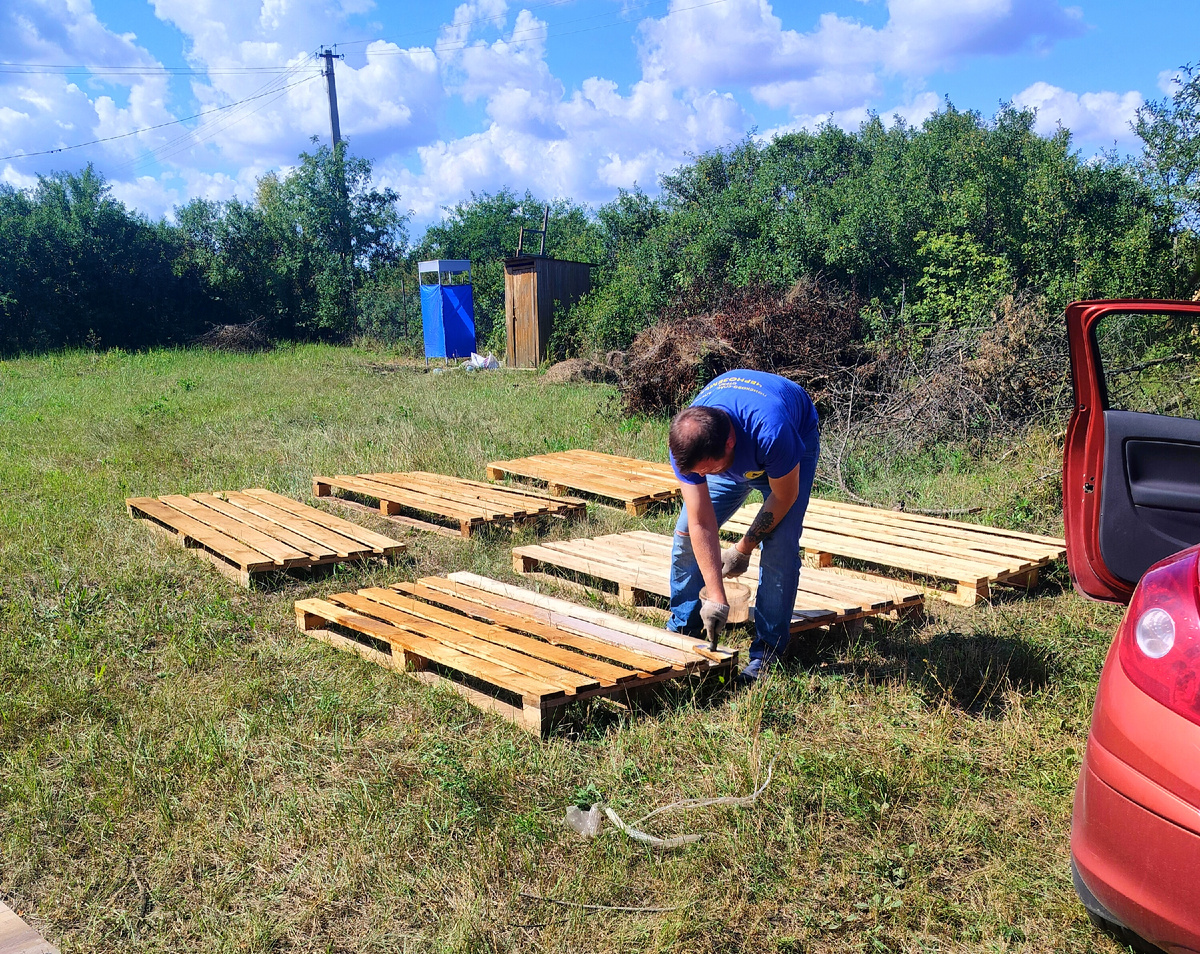 Покумекав, мы решили поставить нашу беседку на деревянное основание. Чтобы было удобнее расставить мебель, прибирать после посиделок, да и не заморачиваться с травой внутри и грязью после осадков. В качестве основного материала взяли поддоны. Сначала их покрасили невымываемым антисептиком глубокого проникновения светло-коричневого оттенка и оставили на несколько дней для полной просушки. Затем расчистили и разровняли место, застелили землю геотекстилем. Разложили поддоны по уровню, скрепили между собой для устойчивости. Сверху будет положен кварц-винил и прикручена сама конструкция беседки. Продолжение следует..))