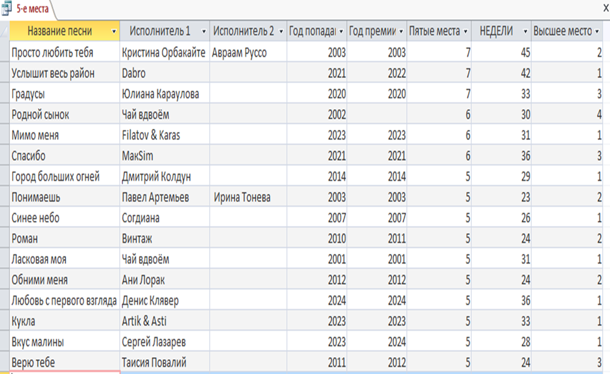 Песни рекордное количество раз занимавшие 5-е места хит-парада "Золотой граммофон"
