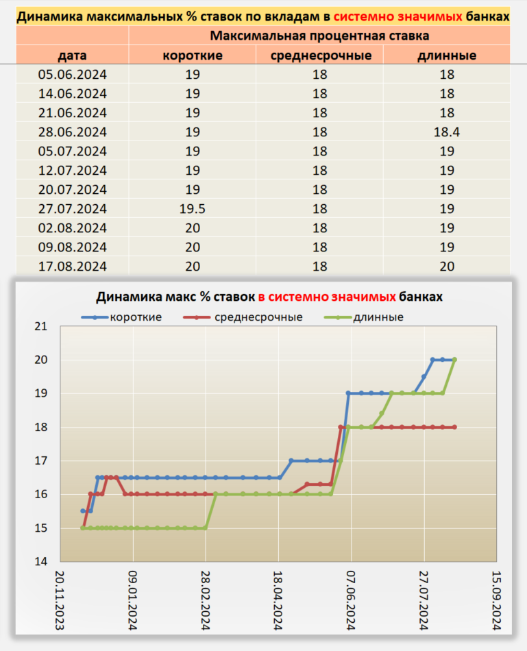 — Существенного повышения ставок по банковским вкладам не произошло, подтянулись «отсталые банки» до рыночных предложений. Можно констатировать то, что на данный момент сберегательные продукты достигли своих максимальных значений исходя из ключевой ставки ЦБ РФ. До осеннего заседания ЦБ РФ, значительных изменений в сторону снижения или увеличения ставок по вкладам не будет.