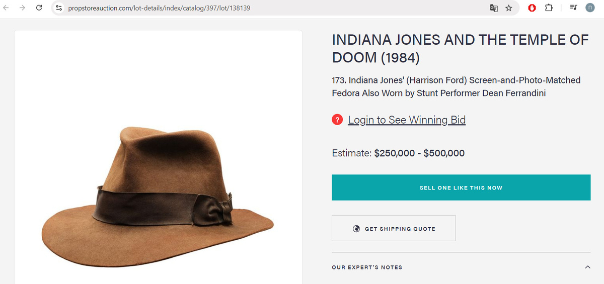 Культовую шляпу Индианы Джонса, которую носил актер Харрисон Форд в фильме 1984 года «Индиана Джонс и храм судьбы», продали на аукционе за 630 тысяч долларов. Об этом стало известно в субботу, 17 августа, из публикации журнала People. Аукцион прошел в Лос-Анджелесе. Эта фетровая шляпа была специально изготовлена для второй части серии фильмов про Индиану Джонса. Она появлялась в кадрах фильма и закулисных съемках. Также шляпу носил каскадер Дин Ферранди. Она попала на аукцион из его личной коллекции. Шляпа отличается от той, в которой Харрисон Форд появлялся в первой части — «Индиана Джонс: В поисках утраченного ковчега». Она имеет более вытянутую форму, еще на ней есть инициалы главного героя — IJ.