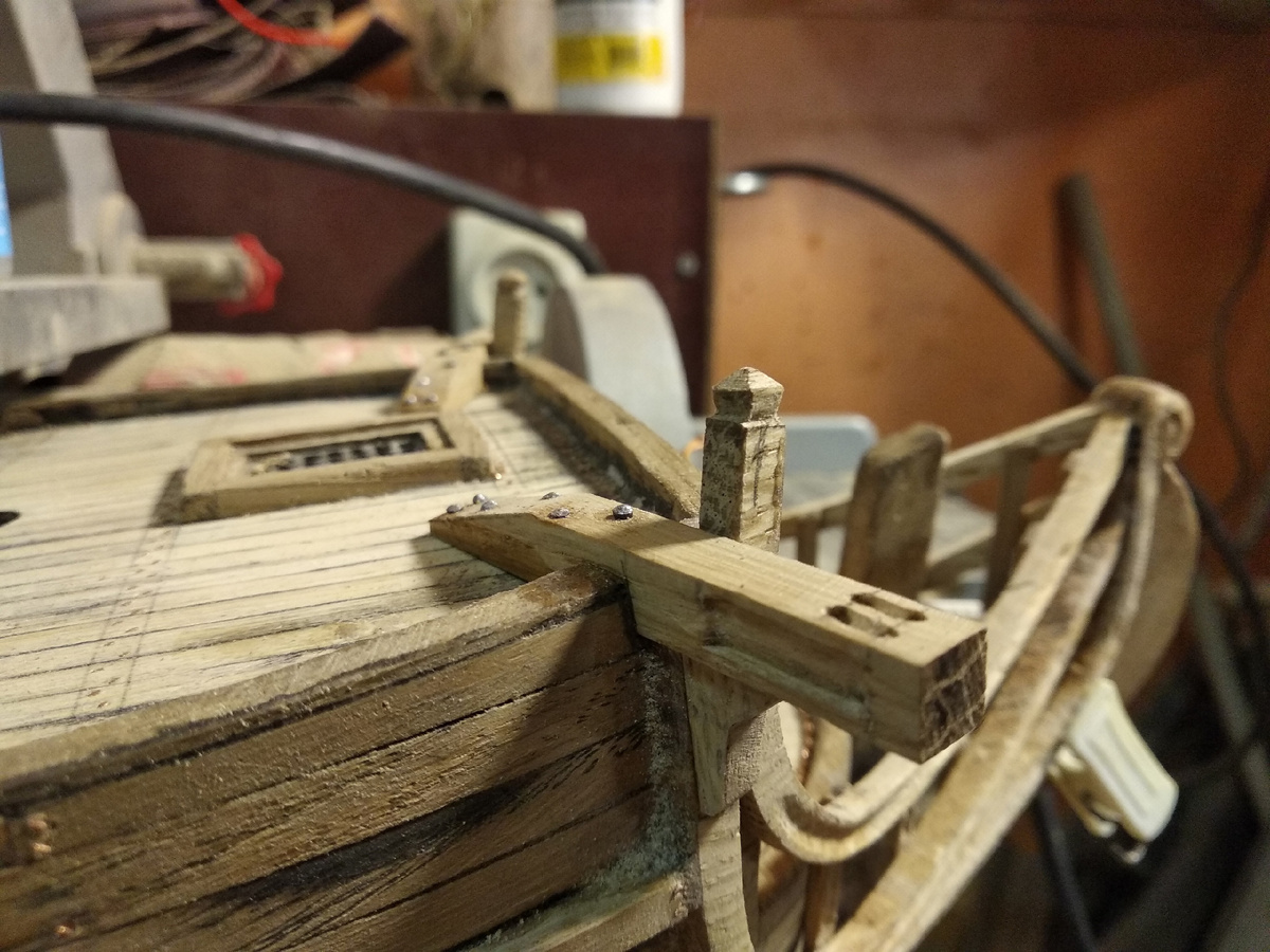 В носовой части судна находиьтся кран-балка.Она служит для подъема якоря. К этой балке прикреплена скоба на которой размещаются один или два блока. Иногда одну из сторон кран-балки украшают головой животного.