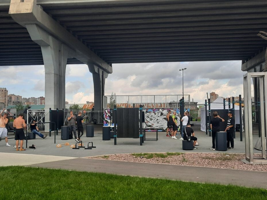 Есть много площадок под мостами, но обычно это центр города или, а вот чтобы под путепроводом громадной магистрали и аккурат между путями железной дороги... Да в одном из самых загруженных транспортных узлов Питера - в легендарном Купчино! Окончания строительства мы ждали с большим нетерпением. И не обманулись.