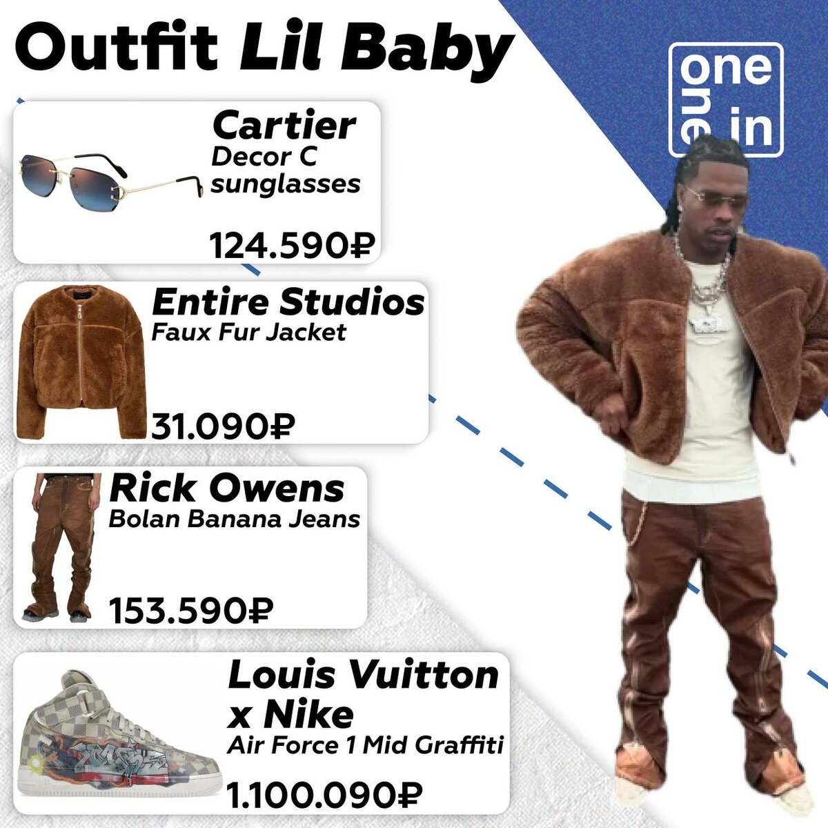 Салют! Добро пожаловать в блог ONE IN ONE. Мы уже больше года радуем наших клиентов люксовыми репликами из Китая. Но сегодня хотели чуть отвлечься и разобрать несколько образов известных реперов. Мы уверены, что многие хоть раз видели классные шмотки на ком-то но не смогли узнать их название или найти в интернет, а тем более купить. Но мы убьем в этот раз 3-х зайцев одним выстрелом и раскроем все карты. Погнали. Самый внушающий предмет — это кроссы от ЛВ и Найки за 1 млн рублей. Таких конечно у нас нет, а вот все остальные моточки можно порыскать и намного дешевле оригинала. Образ получился хайповым, в общем, как и всегда любят современные артисты. Чтобы взяли себе в гардероб? Пишите в комменты. Еще один лил в нашей подборке. Здесь уже немного агресии, яркие акценты и оверсайз шмотки. Некоторые вещи стоят даже не очень дорого, считая современную тенденцию, но если не брать в расчет ремешок и тимбы. Если зохотите взять такие модели, но за адекватные прайс, к примеру до 10К рублей — это