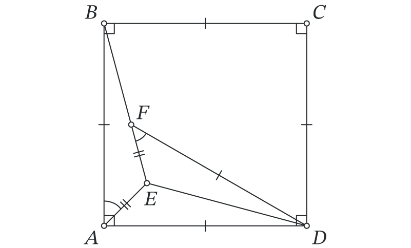 Выберите пару равных треугольников. Кандидаты: △BCF, △ABE, △CDF, △EFC, △ADE, △DFB А тут даже придумывать не надо - по чертежу видно, что AB=DF AE=EF и углы между ними (A и F) отмечены равными. Значит треугольники ABE и FED равны. Но у нас это не спрашивали. Смотрим внимательно на треугольники FED и ADE. FD=AD FE=AE а сторона ED общая, значит они равны по трем сторонам. Мы уже выяснили, что ABE и FED равны, теперь пришли к тому что FED и ADE равны, значит ABE и ADE равны. Ответ: △ABE, △ADE Другие задачи раздела