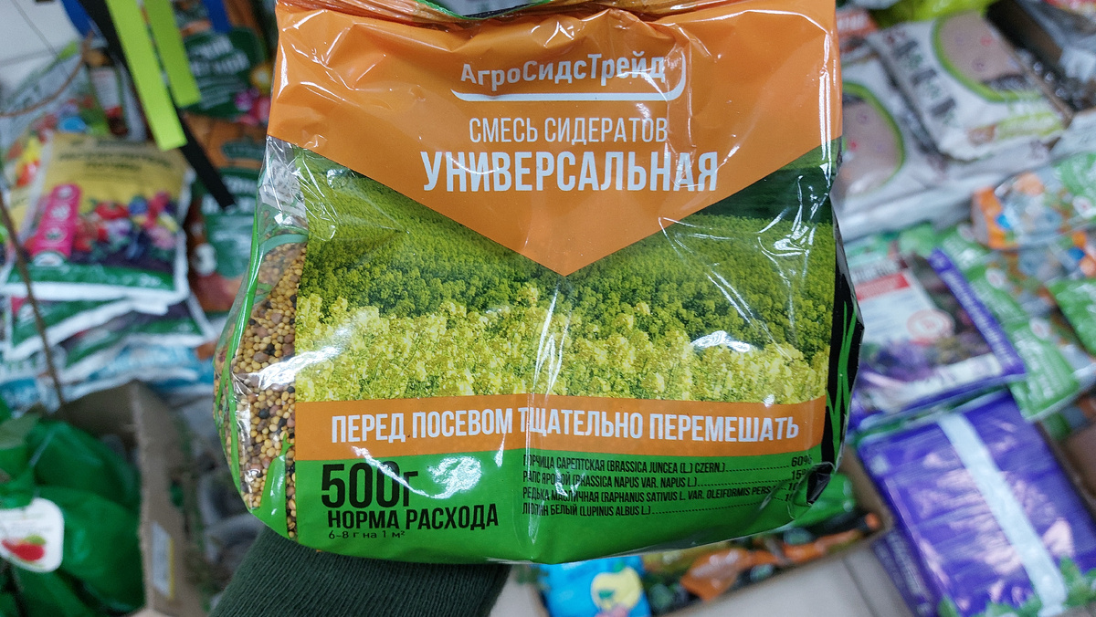 Смесь универсальная 500 г, что входит: горчица, рапс, редька, люпин. Цена с картой 103 рубля, без карты 114 рублей.