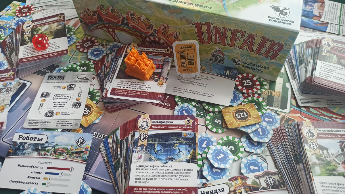 Атмосфера для меня всегда играет немаловажную роль, поэтому я и обратил внимание на Unfair. Тема прекрасно сочетается с местным таблобилдингом и вместе создают, такой, симпатичный и созидательный геймплей, несмотря на наличие такого элемента как «take that». Всё равно очень увлекательно как строить, так и наслаждаться готовым вариантом парка в конце партии.