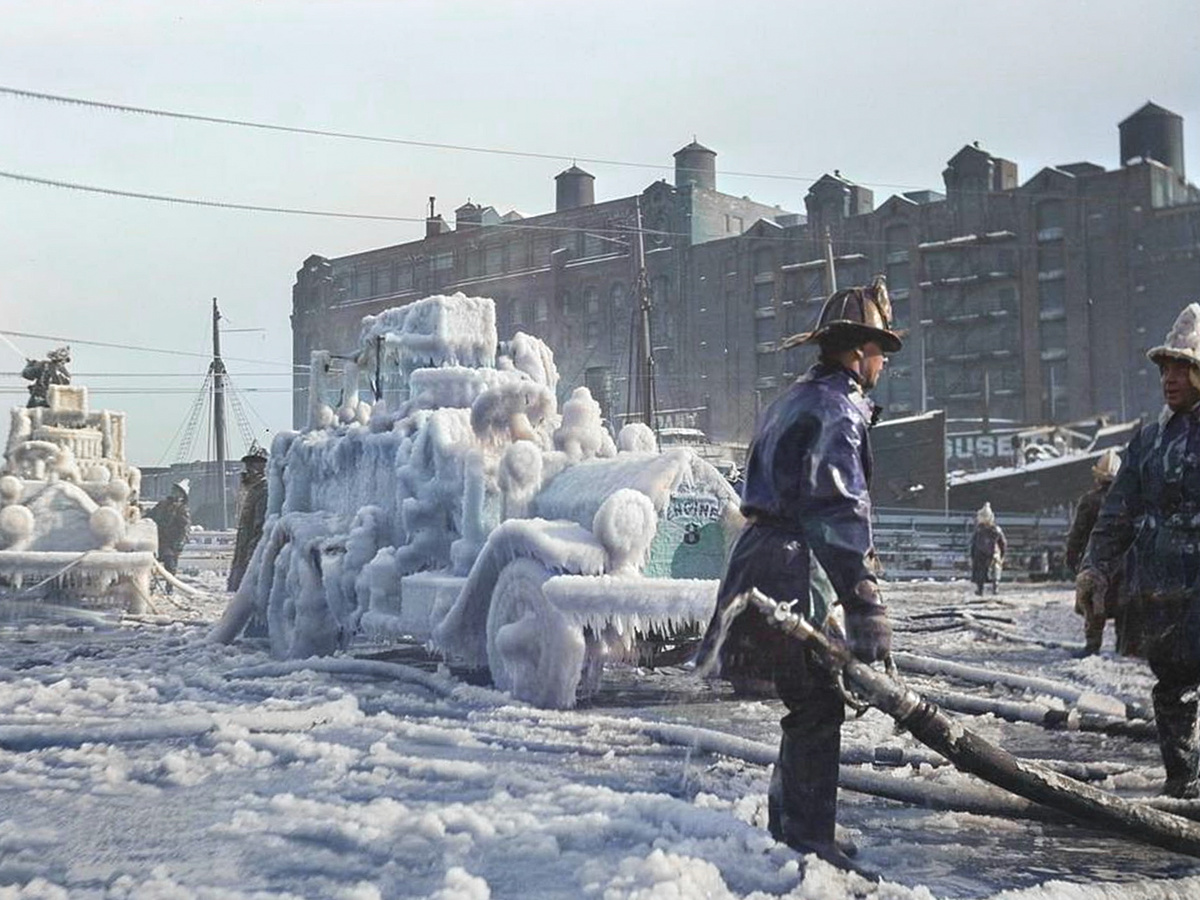 Представляю очередную подборку фотографий, которые были сделаны в Соединённых Штатах Америки на протяжении ХХ века. Все фотографии были раскрашены. Замерзшие пожарные машины после пожара при минусовой температуре в Бостоне, 1920 год. Самая низкая зарегистрированная температура в Бостоне в 1920 году составила -7 градусов по Фаренгейту (-21,7 градуса по Цельсию) 16 февраля 1920 года. Мужчина стоит на силовой актрисе цирка Джоан Роудс, 1955 год. Джоан Роудс – была рестлером, каскадершей и силачкой. Родившись в бедности она и ее братья и сестры были брошены родителями. В 14 лет она убежала из дома и присоединилась к передвижной ярмарке, где у нее появилась идея для своего выступления после того, как она увидела профессионального силача за работой. Изобретатель баскетбола Джеймс Нейсмит тренируется со своей женой, Канзас, 1928 год. Джеймс Нейсмит изобрел ставшую супер-мега популярной игру в 1891-м году, когда работал преподавателем физической культуры в христианском колледже в Спрингфилд