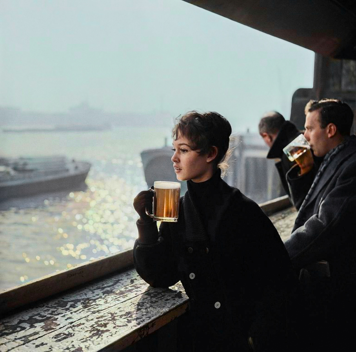 Ещё совсем юная французская актриса фотографируется с пенным напитком в баре и смотрит на пристань. На снимке ей всего 19 лет. Её дебют в кино пришелся на 1952 год в фильме «Нормандская дыра», а за спиной у актрисы больше 80 кинокартин.