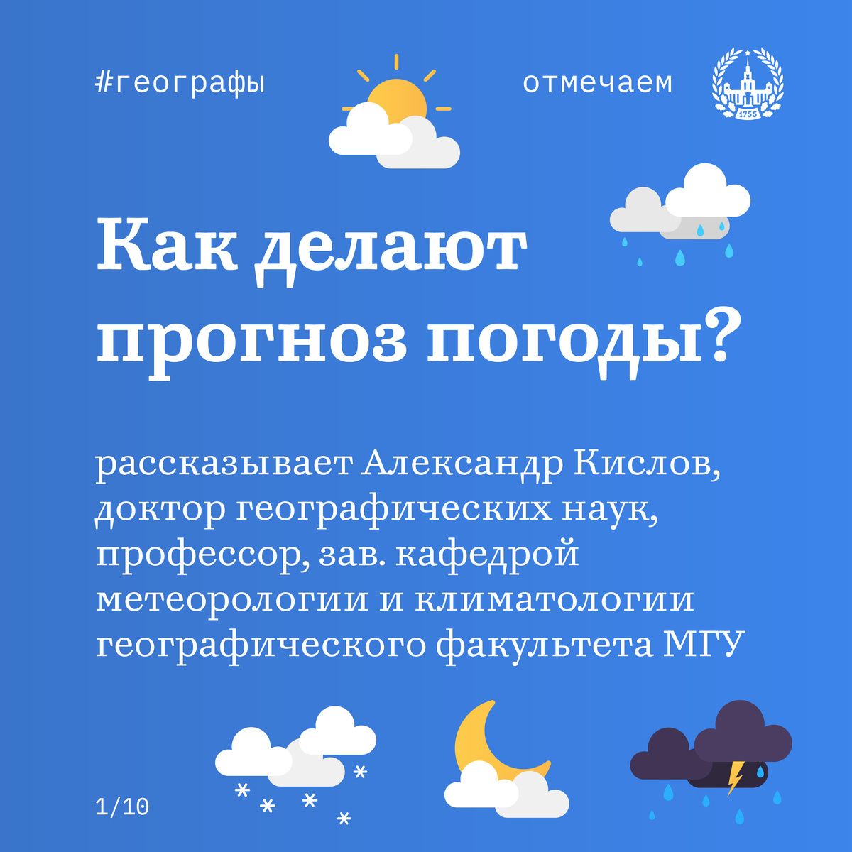 18 августа – день географа! Сегодня насчитывается более сотни видов деятельности географов: они изучают рельефы, растения и животных, запрещают или разрешают купаться в реках и озерах, снимают Землю из космоса, ищут причины трещин в зоне вечной мерзлоты и полезные ископаемые на дне океана, заботятся о природе и многое-многое другое. Кроме того, именно географы прогнозируют метеорологические явления и изменения окружающей среды при изменениях климата. Знаете ли вы, как делают прогноз погоды? Мы пообщались с Александром Кисловым, доктором географических наук, профессором, зав. кафедрой метеорологии и климатологии географического факультета МГУ, и он раскрыл тайны прогнозирования. Листайте в карточках выше или читайте текст ниже! Прогнозы погоды основаны на математическом моделировании текущей и будущей атмосферной ситуации. Прогностические поля метеорологических переменных на финальной стадии интерпретируются специалистами-синоптиками. Они подразделяются с точки зрения заблаговременности